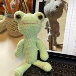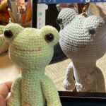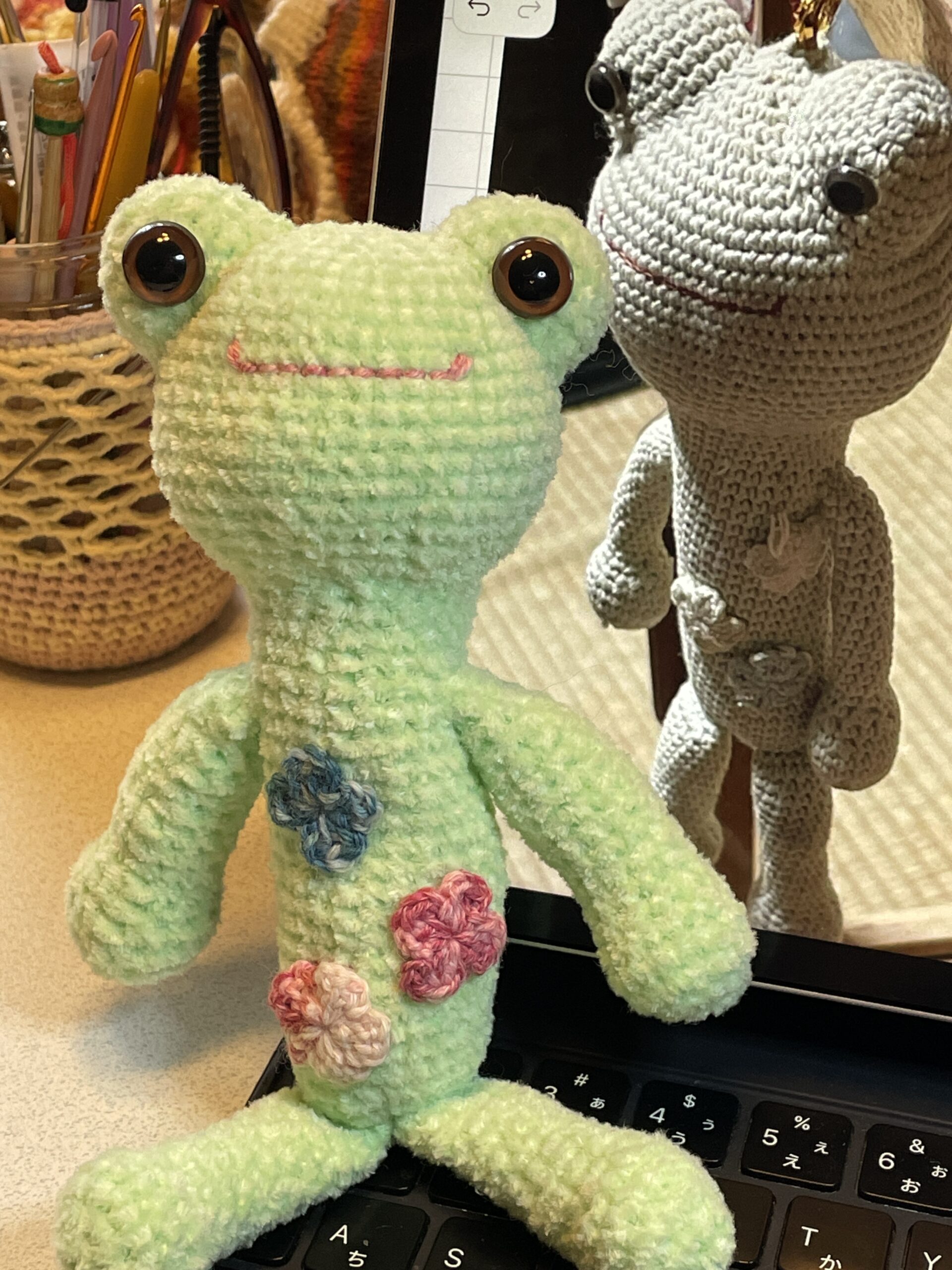 むかし編んで友人にプレゼントしたカエルのあみぐるみ。