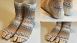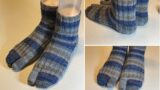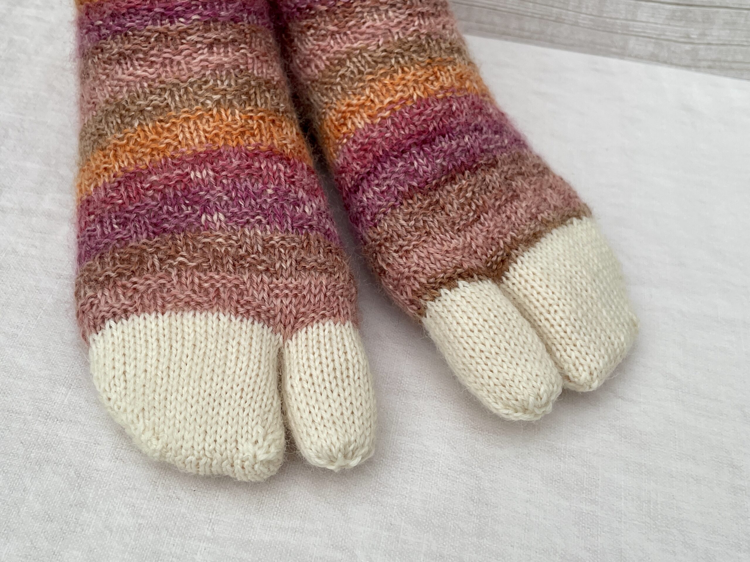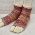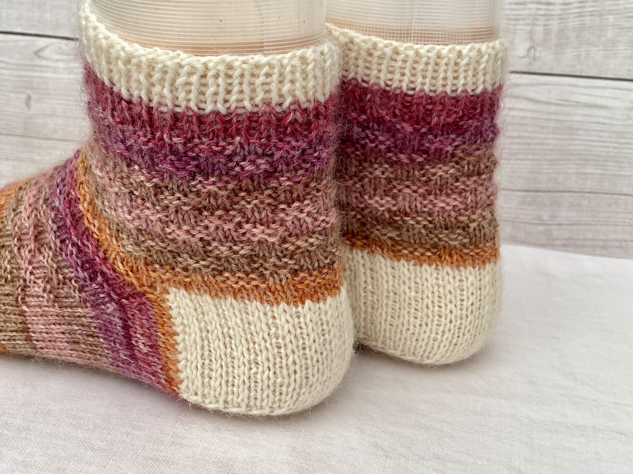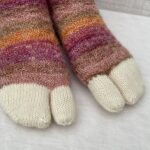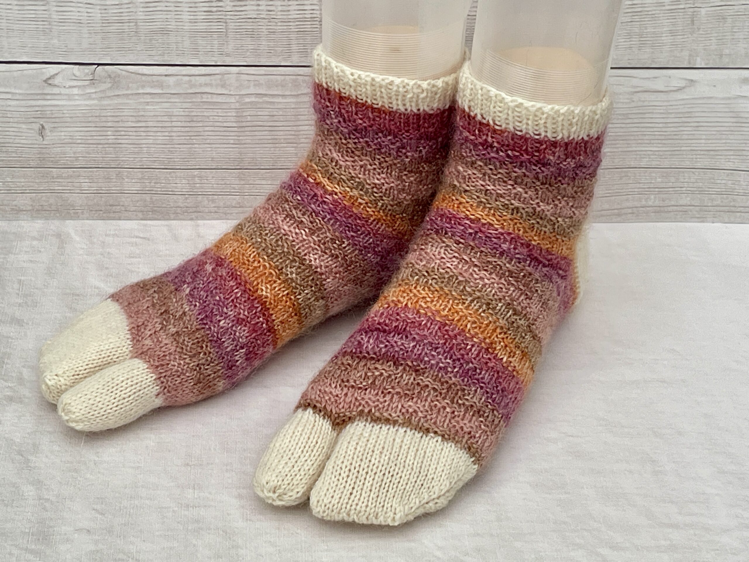 出来上がって見ると、履き口のゴム編みの白は、もう少し長くても良かったかなと思います。足首の丈が短いものは、その方がバランスが良いですね。